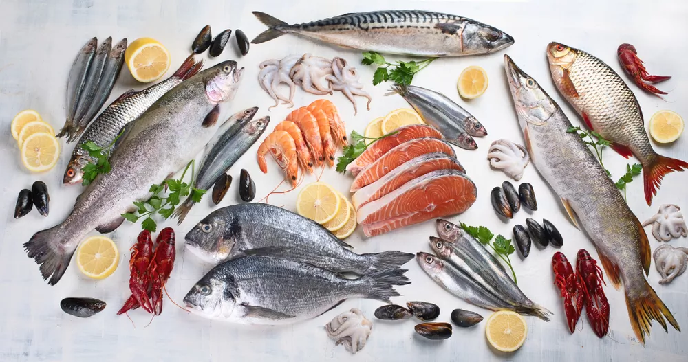 - Fruits de mer : crustacés, mollusques et coquillages comme le homard, bulot, moule, calamar, huître, poulpe, langouste, crevette, Noix de Saint Jacques, crabe…